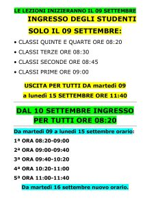 Orario prima settimana di lezione da martedì 9 settembre a lunedì 15 settembre
